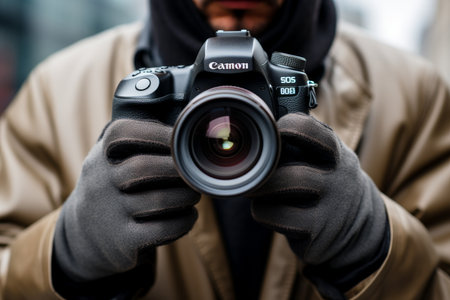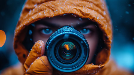 A close-up of a photographer holding a camera, surrounded by icy textures and cold tones, evoking a sense of adventure.