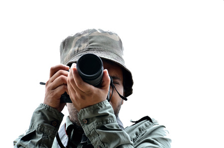 handsome photographer happy young african man Kenya Africa tourist holding photo camera trip around the world white background studio