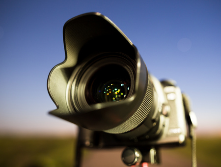 Close view of camera lens. With blurry lansdcape view in the backgruound.