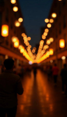 A blurred city street at night, illuminated by warm, glowing bokeh lights from festive decorations and street lamps,...