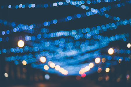 Abstract bokeh of festoon lights on dark background. Christmas and New Year holidays theme background.