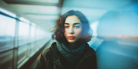 A young woman stands still in a corridor filled with soft light. Her hair is slightly tousled, and she gazes ahead, with reflections visible in the glass around her.