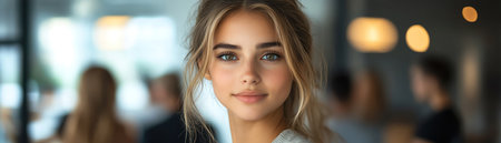 Young woman stands confidently in a business setting, with a blurred background suggesting a corporate environment and professional engagement.