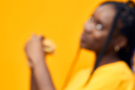 Young woman enjoying a burger in vibrant yellow attire against a bright yellow background, expressing joy and satisfaction in a modern, trendy setting