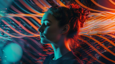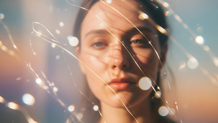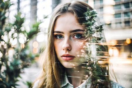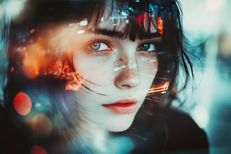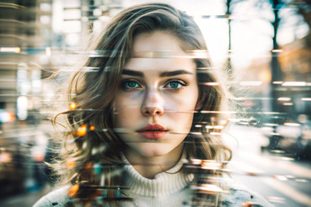 Close up portrait of a young woman featuring double exposure with glitch art elements