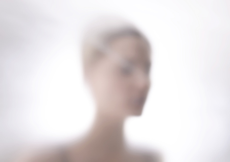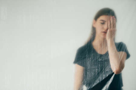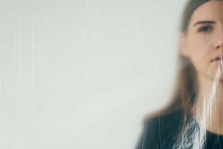Isolation loneliness. Female harassment. Emotions barrier. Defocused portrait of sad helpless woman behind clear polythene cover on light out of focus empty space background.