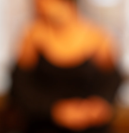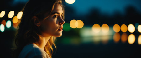 Woman with long, flowing hair stands in profile, lost in thought against a soft, blurred background. The gentle movement captures a tranquil and introspective atmosphere.