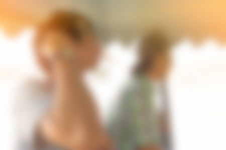 Blurry vertical photo with two unrecognizable women chatting outside on a sunny day. Abstract background with people outside in a sunset sunlight. Friends are speaking, talking and dancing on a street