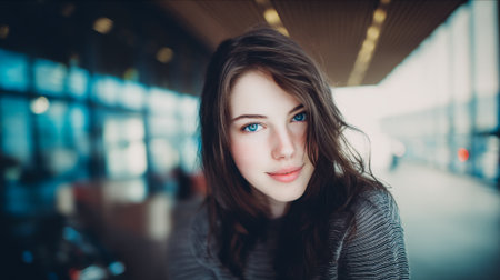 A young woman with striking blue eyes and dark hair smiles gently at the camera. She is wearing a grey, ribbed sweater and is positioned in front of a blurred background of what appears to be an indoor public space with large windows.
