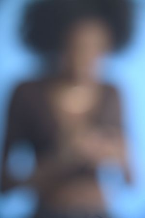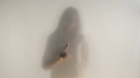 Silhouette of ghost woman in fog behind frosted curtain or glass close up. The woman draws invisible patterns on the glass with her index finger. The concept of the afterlife, the otherworld, ghosts.