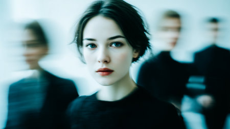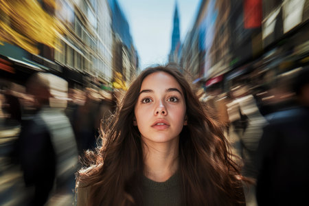 Portrait of a brunette woman standing still in a busy city street with blurred crowd, zoom effect applied