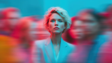 Confident woman in glasses standing still among blurred crowd in neon light.