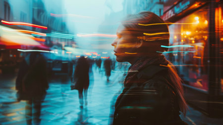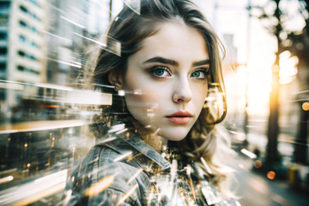 Portrait of a young woman. Conceptual artistic close-up image against the background of a city with double exposure and visual effects. An advertising move.