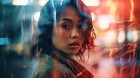 asian thai Street dreamy photo sad woman model window looking at camera portrait reflection soft vintage glare