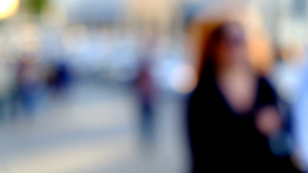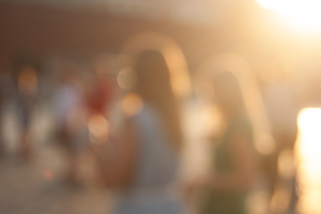 People walking down the street in the evening, beautiful light at sunset. The photo is purposely made out of focus, no faces are recognisible