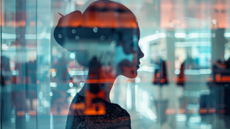 A womans head is visible through a clear glass window, creating a unique visual effect. The reflection of the surroundings adds depth to the image.
