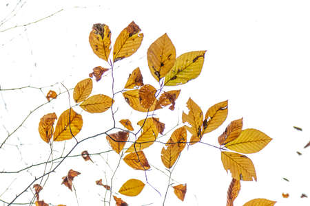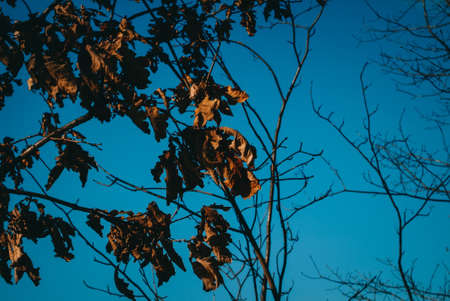 Dry leaves hanging downwards from a tree during the autumn season showing its change of colour from green to brown