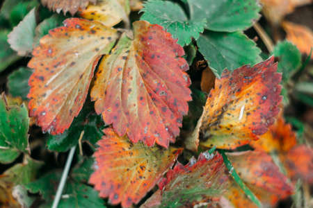 Yellow-red strawberry leaves in late autumn. Care for strawberries in the fall. selective focus.