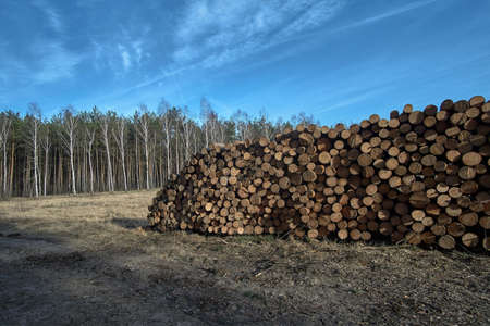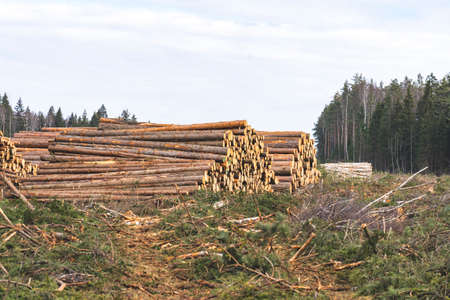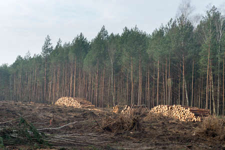 Cut down pine trees. Landscape of cut down trees in the forest. High quality photo