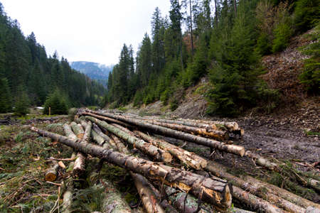 Deforestation of coniferous forests on the slopes of the Carpathian Mountains, western Ukraine.