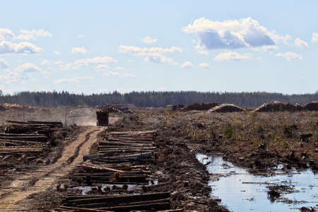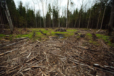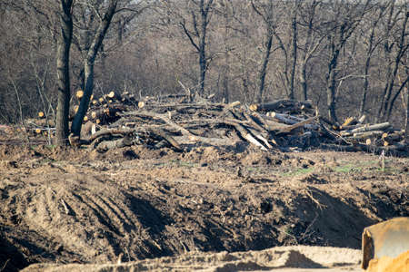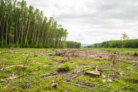 View of the cleared forest. A view of the bare earth, where there used to be poplar trees. Planned deforestation.