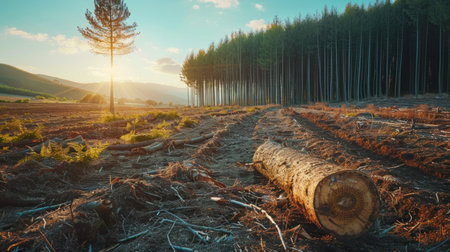 Split image showing deforestation and reforestation. Left side depicts a pile of cut wood, right shows replanted pine trees. Warm lighting contrasts the barren and lush landscapes. Depicts environmental themes of sustainability and renewal.