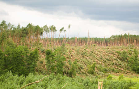 A serene forest landscape showcases fallen trees after a storm, under dark clouds. The scene captures nature's beauty and resilience, inviting reflection on ecological impacts.