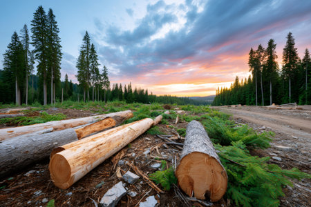 Logs lying on the ground in a clear-cut forest area with a vibrant sunset
