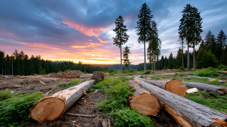 Felled tree logs and stumps mark a clearcut area with a forest edge and sunset sky