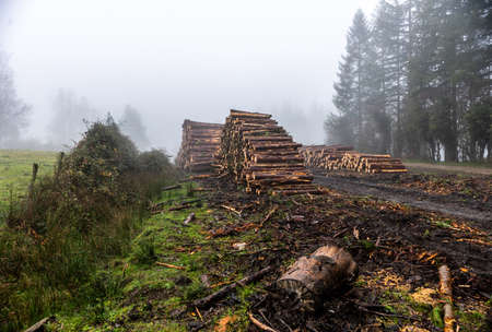 A stack of freshly harvested timber rests in a clearing amidst a dense, misty evergreen forest.