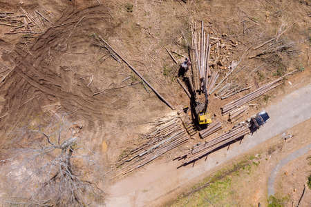 Aerial view of a timber logging site with logs neatly stacked and machinery in motion in a deforested area.. AI generated.