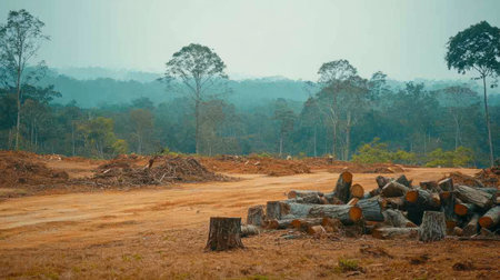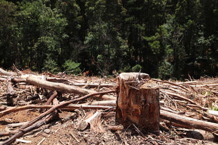 A stark view of a deforested area with tree stumps and logs scattered across the landscape, highlighting the consequences of logging and habitat disruption on environment.