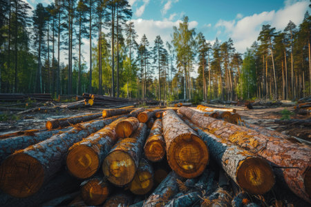A rugged pile of log trunks at a logging site, representing the timber industry and the natural beauty of pine wood.