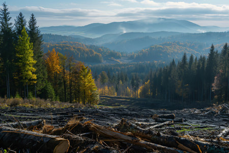 Dramatic panoramic view of a vast deforested area with scattered logs and stumps amid surrounding pine forests and mist-veiled peaks under warm sunset glow, ideal for environmental campaigns, forestry ads, and nature documentaries. Captures raw land transformation for impactful banners, editorial features, and climate awareness visuals.