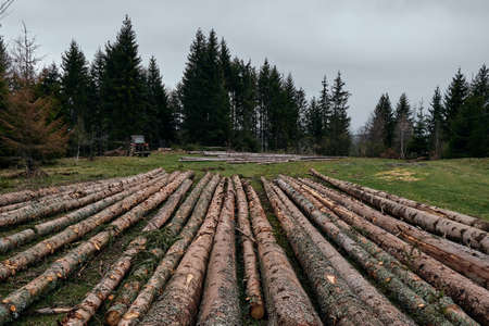 felled trees stacked in the forest freight forwarder and stacks of logs at the edge of the forest stock of firewood