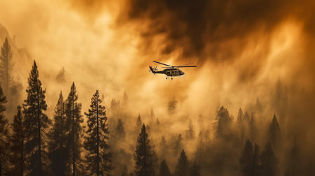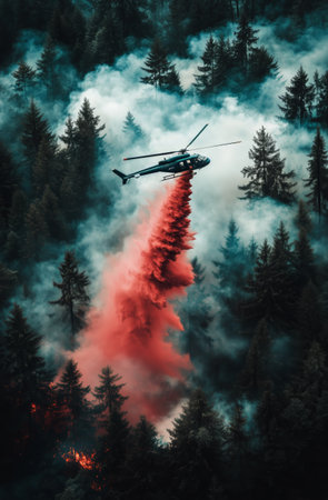 A helicopter releases fire retardant over a forest fire, combating the flames in a mountainous region. Smoke billows as trees are engulfed in intense heat and fire.