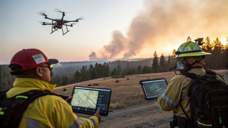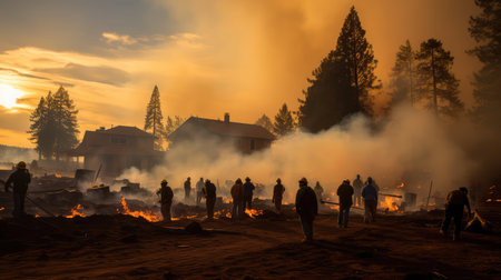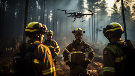 Drone above firefighters in smoke-filled forest ai generated photo realistic image. Wildfire management photography wallpaper. First responders picture scene. Emergency service concept photorealistic