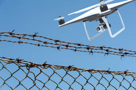 Drone with digital camera flying over a barbed wire fence: 3D rendering