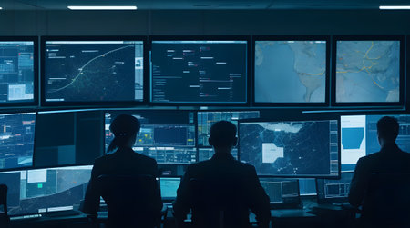 Team of military specialists operate in a secret service command post, managing surveillance systems and data protection to ensure the safety and security of classified information. Camera B.