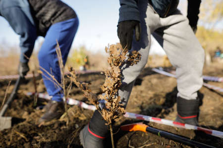 Shallow depth of field (selective focus) image with an oak sapling during an autumn tree planting.