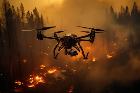 Use in the disaster area, a drone explores the condition of the fire areas in the wilderness, copy space.