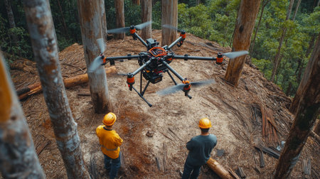 Drone Surveying Forest Area With Two Workers Observing In Afternoon Light