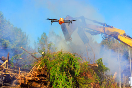 Place, an inspector uses drone to oversee the burning of uprooted trees during land preparation during construction