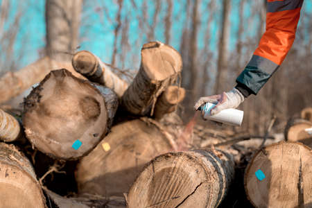 Forestry technician marking logs for firewood with red aerosol can paint, forester working in forest, close up of hand