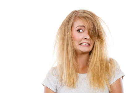 Bad hairstyle concept. Crazy, mad blonde woman with messy hair looking stressed out. Studio shot on white background.