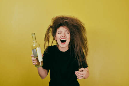 drunk girl with a bottle of wine on a yellow background