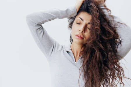 Love Yourself. Close up Shot Curly Latin Female in Pastel Gray Sweater Stroking Hair Closing Eyes, Posing Isolated At White Studio Wall Background. Fashion Seasonal Sale New Collection Concept