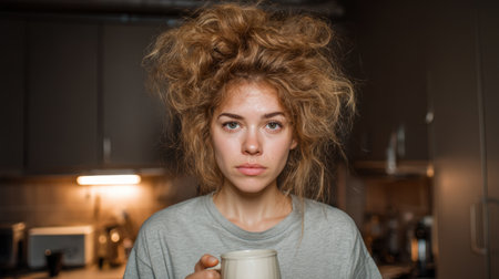 A young woman with exuberant curly hair holds a warm mug in her hands, embodying the essence of morning calmness in her cozy kitchen environment.