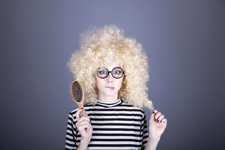 Dry and damaged hair, Hair loss problems cause by heat hair styling tools (straightener), Funny girl and bad hair day.