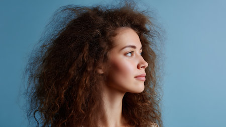 Portrait of a beautiful young woman with curly hair on a blue background